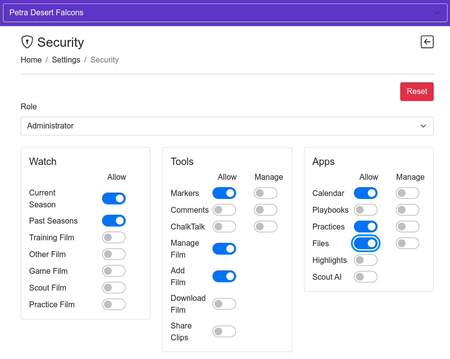 - Game Film - Allows/disallows the selected role to view any film marked as 'Game'.